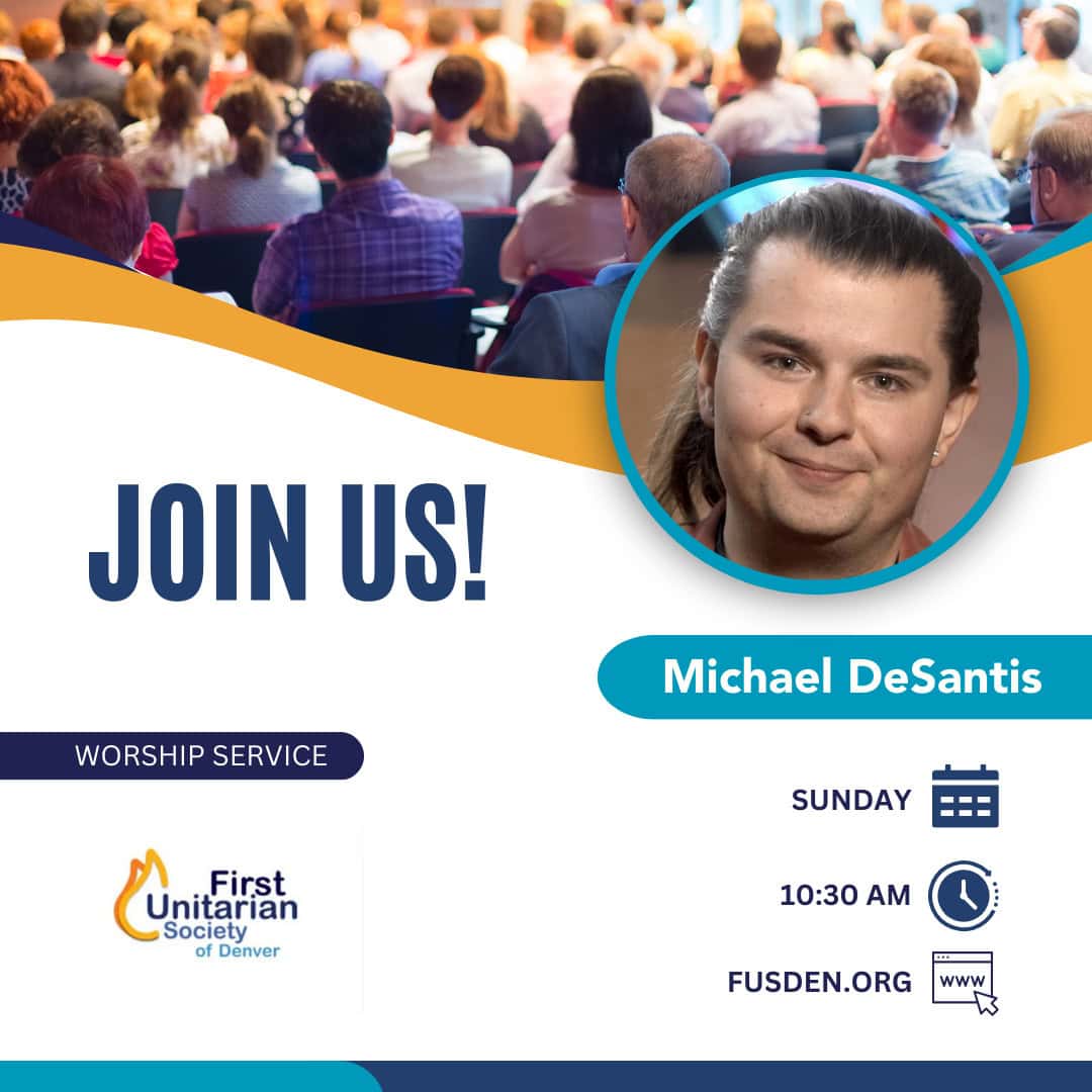 New to Unitarian Universalism? Wondering how you can get involved at First Unitarian (or even how you can become a member)? We welcome you to join New to Unitarian Universalism? Wondering how you can get involved at First Unitarian (or even how you can become a member)? We welcome you to join us on Saturday, January 10, from 9 am-12 pm for our next Finding Yourself at First Unitarian class. Facilitated by our Ministerial Resident, Michael DeSantis, this participatory class introduces newcomers to our UU faith and our First Unitarian community. All are welcome, but you must pre-register here. Can’t make it? Join us next time on Saturday, February 28, 2025. If you have any questions, please reach out to Michael at michael@fusden.org. First Unitarian Society of Denver 1400 N. Lafayette St 11jan10:30 am11:30 amA Gift We Give Each Other Join us for our “A Gift We Give Join us for our “A Gift We Give Each Other” service with guest speaker Birch Cue. Liberation is a massive physical and spiritual undertaking, but showing each other the way to it is a small way we bring it to life. Join us in taking a fresh look at what an old story can teach us about this. We warmly invite you to join us in person or, if you prefer, participate online. We look forward to seeing you there! Our service streams to Youtube and Zoom (meeting ID is 466-677-668 and the password is 454623). Join us for coffee in the Community Room after the service. About Birch Birch Cue (they/them) is the Intern Minister at First Universalist Church of Denver. They are a student at Meadville Lombard Theological School, and will complete their Master of Divinity degree in May 2026. When not in school or at church, they enjoy sewing, baking bread, and spending time outside with their spouse and dog. First Unitarian Society of Denver 1400 N. Lafayette St 11jan12:00 pm1:00 pmWhole SoUUl Studio Whole SoUUl Studio will be a monthly, faithful, educational, communal gathering with a focus on religion and community. We will gather in the sanctuary at 12:00 on the first (or Whole SoUUl Studio will be a monthly, faithful, educational, communal gathering with a focus on religion and community. We will gather in the sanctuary at 12:00 on the first (or occasionally second) Sunday of each month, after Sunday service, to learn, explore, share, and grow together for about 45 minutes. Facilitated by Michael DeSantis and occasionally others, Whole SoUUl Studio is intended to be connective and nourishing for all our members and friends! . First Unitarian Society of Denver 1400 N. Lafayette St 18jan10:30 am11:30 amNo Justice, No Peace Join us for our “No Justice, No Peace” service with our Ministerial Resident, Michael DeSantis.