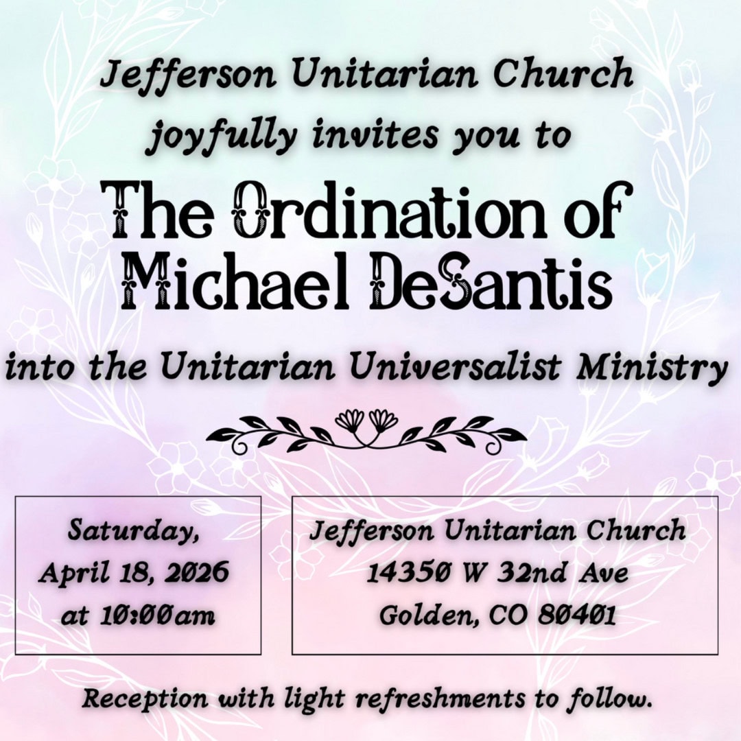 In a divided An Original Jukebox Musical Written by Erica Trisler & Alisha Bashaw What begins as one vulnerable song becomes a movement. In a divided world overwhelmed by noise, fear, and distraction, a teenager dares to share something honest. What spreads next isn’t chaos — it’s connection. People begin listening. Talking. Feeling. But not everyone is ready for that kind of change. Featuring powerful anthems from artists like Billy Joel, Kenny Loggins, Justin Timberlake, Simon and Garfunkel, Taylor Swift, and more, Ripple is a high-energy, heart-forward musical about empathy, courage, and the light that gets in when we open ourselves to one another. Starring actors, singers, and dancers from within and outside of First Unitarian and children from Denver Children’s Choir Created and performed by Souul Stage — Denver’s inclusive, all-ages community theatre company — this production celebrates the beauty of people showing up exactly as they are. Performances: • April 17 at 7:30 PM • April 18 at 2:30 PM • April 18 at 7:30 PM Come be part of something that shines. First Unitarian Society of Denver 1400 N. Lafayette St 18apr10:00 am12:00 pmOrdination of Michael DeSantis All First Unitarian members and friends are joyfully invited to attend the ordination of our very own Ministerial Resident, Michael DeSantis! The ordination service will be at 10 am on All First Unitarian members and friends are joyfully invited to attend the ordination of our very own Ministerial Resident, Michael DeSantis! The ordination service will be at 10 am on Saturday, April 18, at Jefferson Unitarian Church (14350 W 32nd Ave, Golden, CO 80401). Childcare will be provided, and a reception with light refreshments will follow the service. The service will also be live-streamed. For more info or to RSVP, visit Michael’s ordination website. May 02may5:00 pm7:00 pm2026 Annual Auction - Together Again in our Blue Boat Home! Together Again in our Blue Boat Home!
