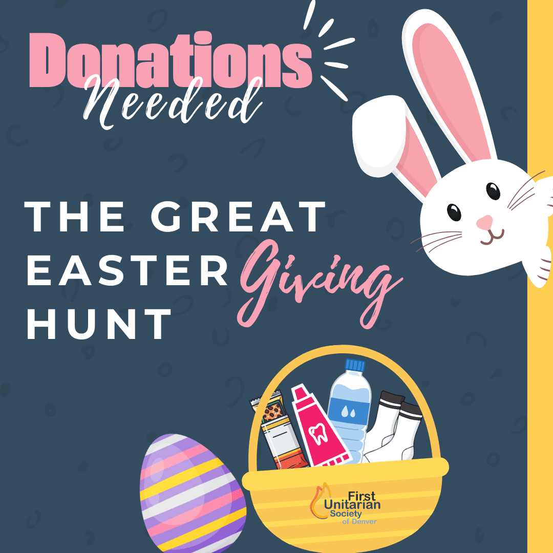Instead of hunting for candy on Easter Sunday, our children will be hunting for something even sweeter Instead of hunting for candy on Easter Sunday, our children will be hunting for something even sweeter — your donated goods! Here’s how it works: Please purchase the requested items from the list below, bring them to church by April 4th, and place them in the labeled bins near the front door. Before the Easter service, the goods will be hidden throughout the church. On Easter morning, when we go to classes, the children will search for them and then work together to assemble care kits for folks who are unhoused. This year, we’ll be filling gallon-sized Ziploc bags with practical items that beloved souls who are unhoused might find helpful. After the children put the kits together, congregants will be invited to pick up a few on April 12th to keep in their cars and share with folks they encounter who may need them. It’s an Easter egg hunt with heart — helping all of us to live our UU Shared Values of Generosity and Love and model those values in real, tangible ways for our youngest congregants. Please help us make our annual Easter tradition a success this year! If you are financially able, please purchase any of the following items so we can put together care kits of helpful items for those who need them: Please drop your donations off just inside the front door by April 4th. Thanks in advance for helping us make this year’s event fun and meaningful for our children. Feel free to email msleslie@fusden.org with any questions. First Unitarian Society of Denver 1400 N. Lafayette St 05apr9:15 am12:00 pmEaster Sunday - Make Easter Subversive Again Join us for our Easter Sunday Services at 9:15 AM or 11 AM!