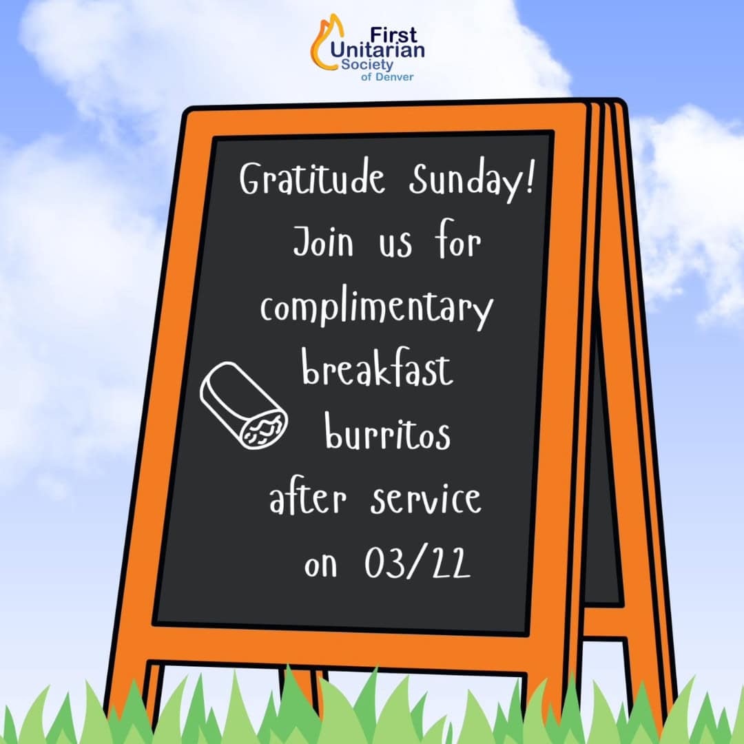 From war breaking out in the Middle East, ICE and fascist From war breaking out in the Middle East, ICE and fascist repression here all across the US, ongoing genocides in Palestine and Sudan, to all the griefs and struggles we personally hold and navigate every day, it certainly can feel like this world is falling apart here in 2026. How can we speak of gratitude in these times filled with so much suffering and injustice? As we approach the Jewish holiday of Pesach (Passover) – a holiday that is grounded in giving thanks for liberation – we are called upon to ask what gratitude can offer us in these dark and difficult times. Most of all, we are called upon to ask what gratitude can help us offer each other. About our Michael We warmly invite you to join us in person, or if you prefer, you can also participate online. We look forward to seeing you there! Our service streams to Youtube and Zoom (meeting ID is 466-677-668 and the password is 454623). Join us for coffee in the Community Room after the service. First Unitarian Society of Denver 1400 N. Lafayette St 22mar11:30 am12:30 amJoin us for Gratitude Sunday! Free Breakfast Burritos!